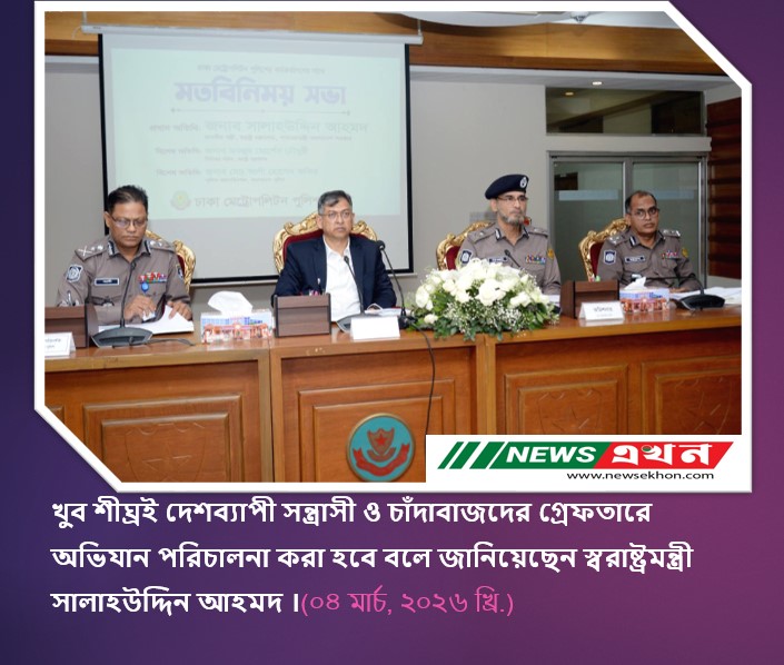 ঢাকা (০৪ মার্চ, ২০২৬ খ্রি.):খুব শীঘ্রই দেশব্যাপী সন্ত্রাসী ও চাঁদাবাজদের গ্রেফতারে অভিযান পরিচালনা করা হবে বলে জানিয়েছেন স্বরাষ্ট্রমন্ত্রী সালাহউদ্দিন আহমদ।