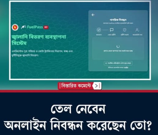 এবার তেল নিতে লাগবে কিউআর ডিজিটাল ‘ফুয়েল পাস’এবার তেল নিতে লাগবে কিউআর ডিজিটাল ‘ফুয়েল পাস’এই উদ্যোগের মূল লক্ষ্য হলো আতঙ্কিত হয়ে অতিরিক্ত জ্বালানি কেনা ঠেকানো। সেই সাথে ফিলিং স্টেশনে ভিড় কমানো এবং সরবরাহ ব্যবস্থায় শৃঙ্খলা আনা। প্রাথমিকভাবে মোটরসাইকেল দিয়ে এই কার্যক্রম শুরু করার পরিকল্পনা রয়েছে।