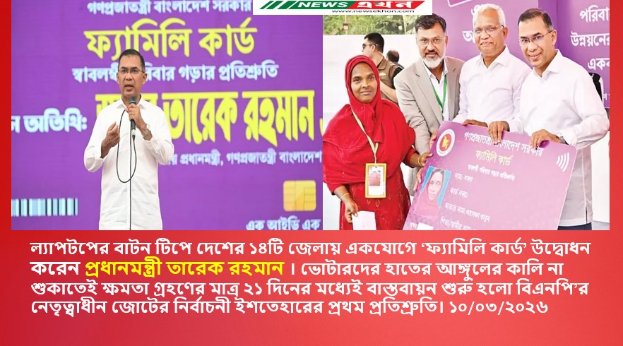 ভোটারদের হাতের আঙ্গুলের কালি এখনো শুকায়নি। ক্ষমতা গ্রহণের মাত্র ২১ দিনের মধ্যেই বাস্তবায়ন শুরু হলো বিএনপি’র নেতৃত্বাধীন জোটের নির্বাচনী ইশতেহারের প্রথম প্রতিশ্রুতি। গতকাল ল্যাপটপের বাটন টিপে দেশের ১৪টি জেলায় একযোগে ‘ফ্যামিলি কার্ড’ উদ্বোধন করেন প্রধানমন্ত্রী তারেক রহমান। এসময় নারীসমাজকে অর্থনৈতিকভাবে ক্ষমতায়নের পাশাপাশি জনগণকে দেয়া নির্বাচনী প্রতিশ্রুতি থেকে বিন্দুমাত্র অবস্থান পরিবর্তন না করার আশ্বাস দেন প্রধানমন্ত্রী।